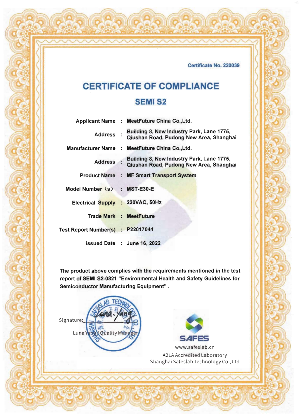 自 2018 年以来,太阳成集团tyc234cc科技取得了国际标准化组织(ISO)质量管理体系(ISO 9001)、环境管理体系(ISO 14001)和职业健康安全管理体系(ISO 45001)认证。在AMHS产品技术体系领域,我们遵循半导体设备标准通讯协议,包括SEMI E37、 E82、E30、 E84、E10 等,使其易接入半导体晶圆厂MES系统来实现数据交互。