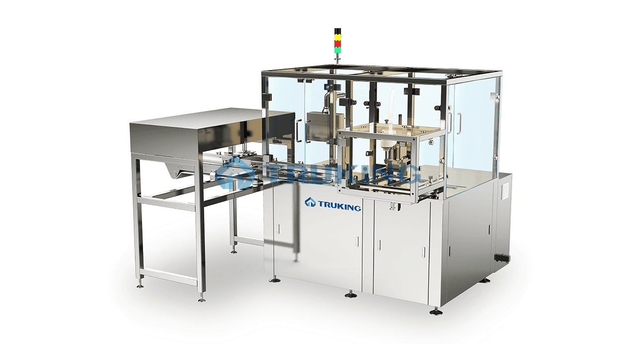 Sistema robótico inteligente trabalhando em sincronização para desmontar materiais de embalagem e transporte de recipientes farmacêuticos e de alimentos para a máquina de alimentação. O sistema substitui a operação manual e eleva as capacidades da planta para o próximo nível.